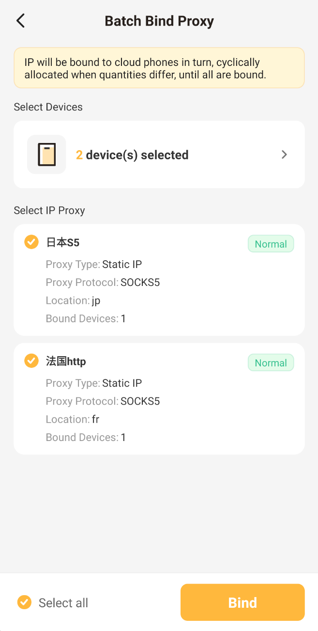 If you have multiple IP proxies, you can also choose batch binding in the sidebar, selecting multiple devices and multiple IP proxies to automatically bind.