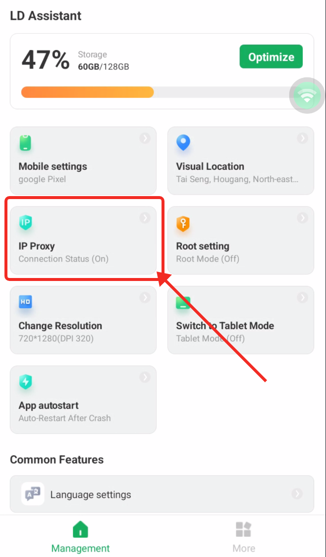 4、After successfully binding the IP proxy, you can go to the built-in LD Phone Assistant in the cloud phone to check the IP proxy status.