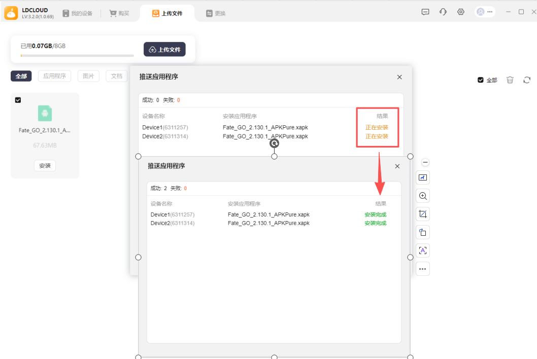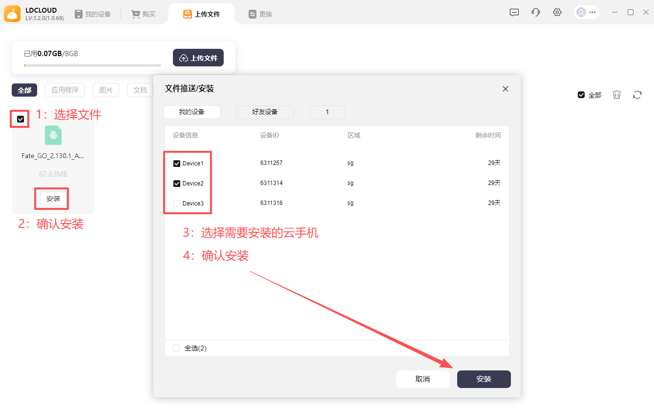 第一步:选择需要批量安装的文件,再选择安装,确认好需要安装的云手机后,确认安装
