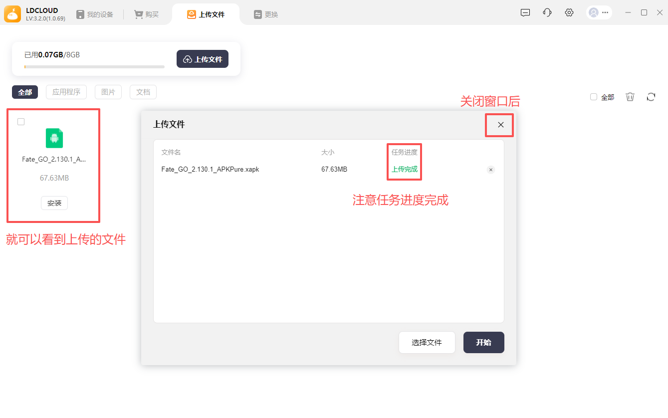 第二步:选择好文件后,开始上传,在任务进度上传完成后关闭上传窗口,就可以完成看到上传的文件应用
