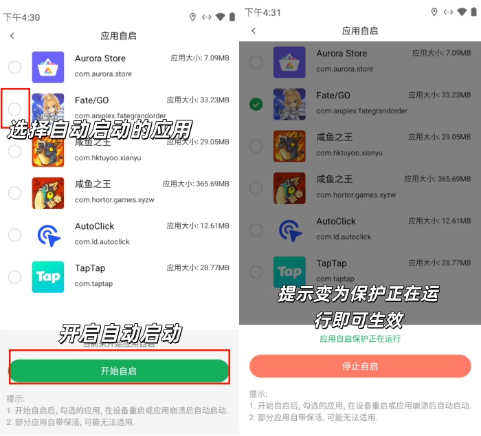 1:进入应用自启功能页面后,勾选您需要开启自动重启的目标应用,点击「开始自启」按钮;