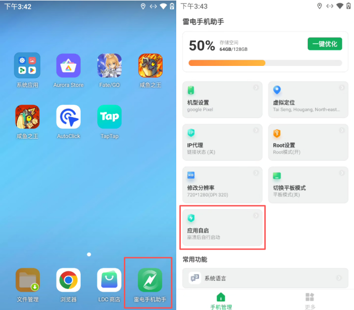 1:打开云手机主页面,在页面右下角找到「雷电云手机助手」,点击进入助手界面,即可找到应用自启功能。