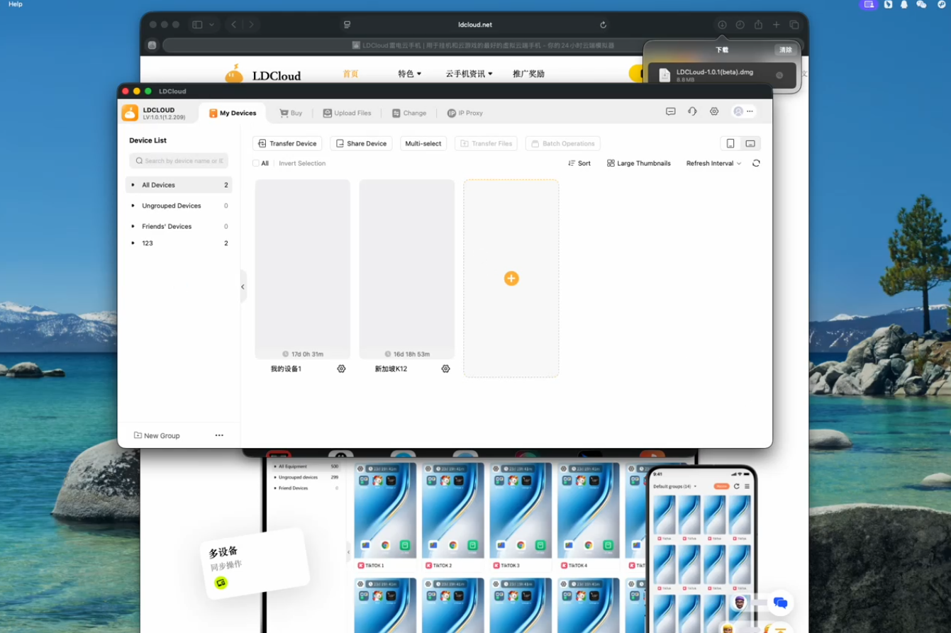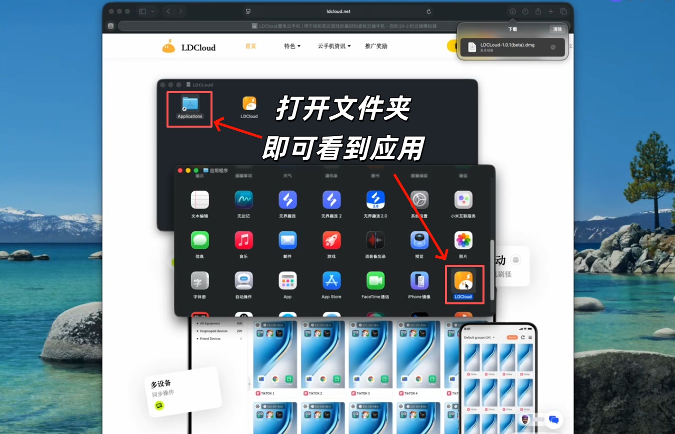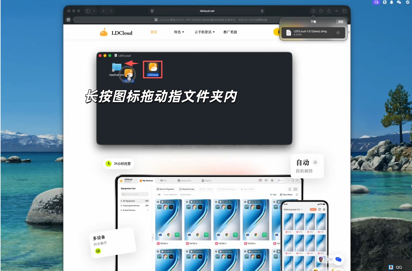 第三步:下载完成后打开安装文件,长按ldcloud图标,将其拖动至应用文件夹中,双击打开文件,即可看到LDCloud应用