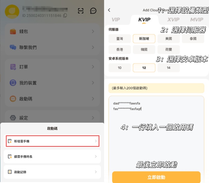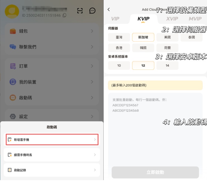 - 單台裝置新增:點擊【新增雲手機】,先選擇伺服器,然後選擇安卓系統版本,最後把啟動碼輸入進輸入欄裡