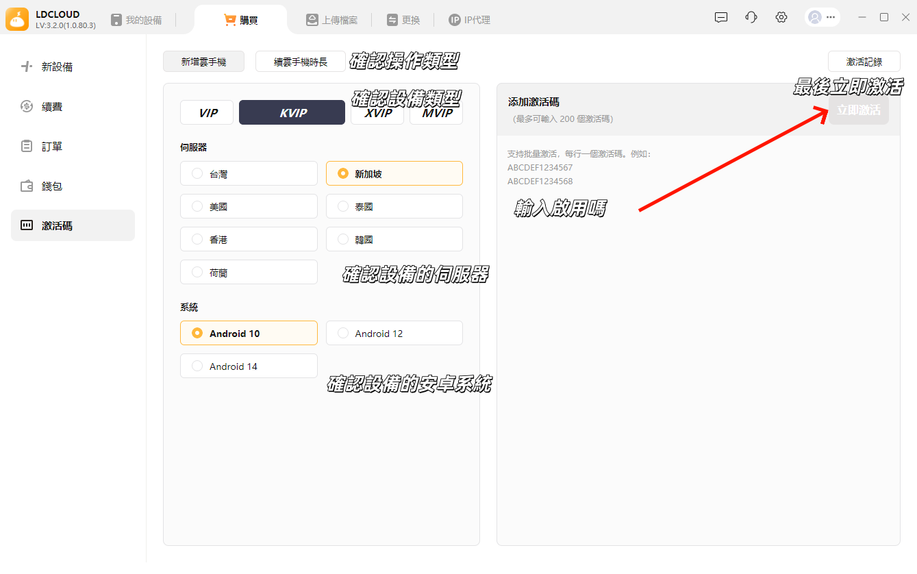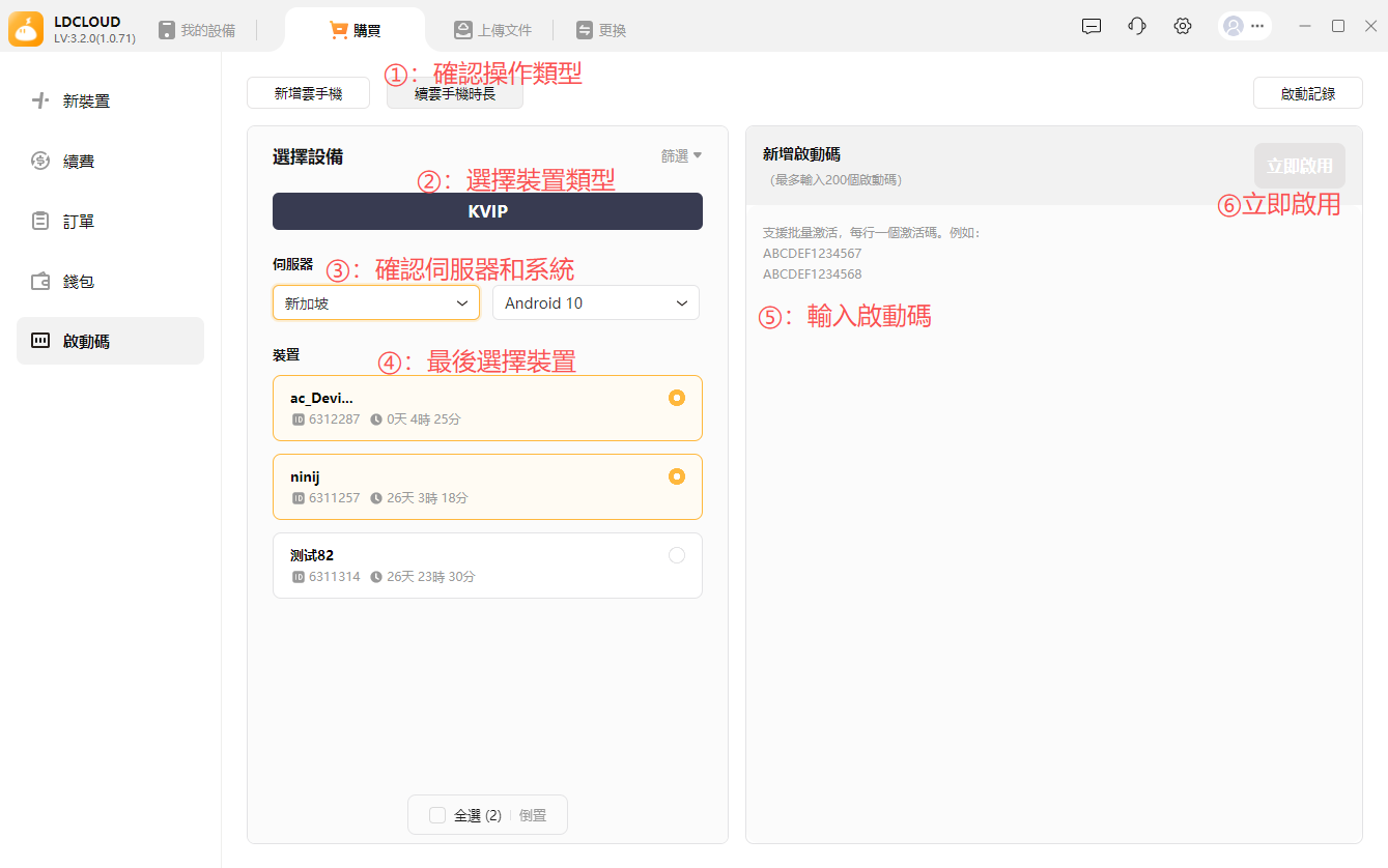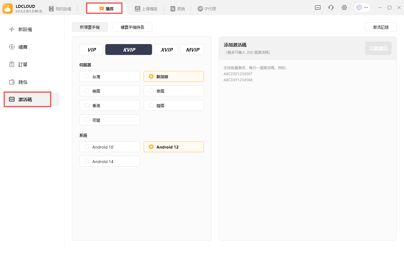 打開「啟用碼」功能,選擇「新增雲手機」。