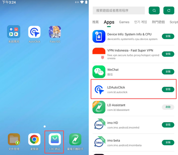 開啟您的ldcloud手機 → 進入雲手機內的LDCstore → 搜尋「 AutoCick」,即可下載安裝對應工具。