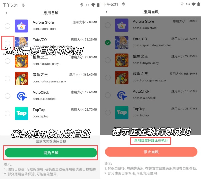 1:進入應用程式自動啟動功能頁面後,勾選您需要開啟自動重啟的目標應用程式,點選「開始自動啟動」按鈕;