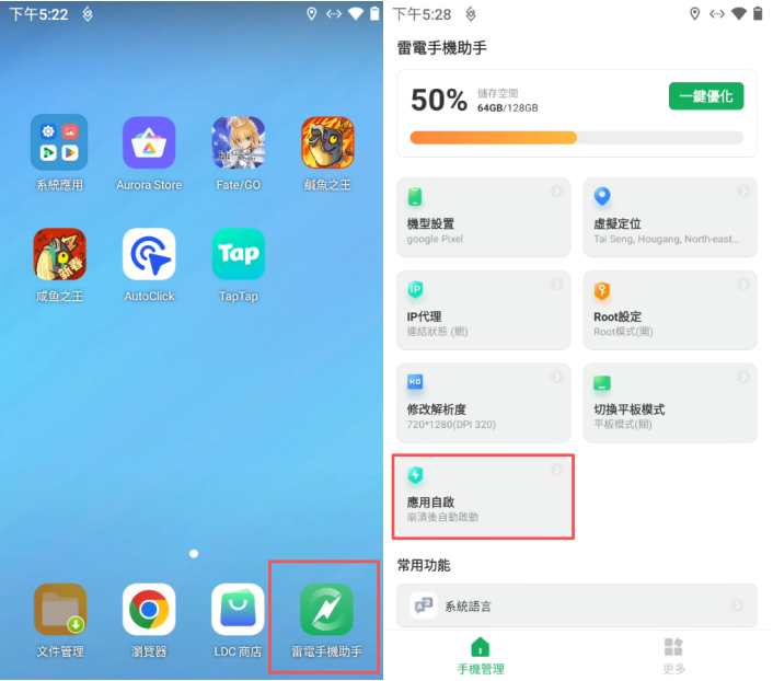 1:開啟雲手機主頁面,於頁面右下角找到「雷電雲手機助手」,點選進入助手介面後,即可找到「應用程式自動啟動」功能。